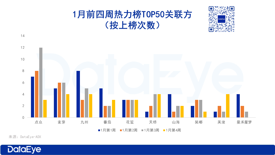 1月前四周,点众、麦芽和九州三家表现最为强势,番茄、花笙、天桥、山海、昊嘟、芙浚、曼禾星梦等关联方也表现活跃。