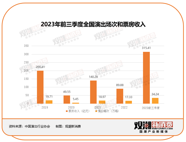 中国演出行业协会的数据显示,2023年前三季度,国内的演出场次达到34.24万场,票房收入315.41亿元,均已远远超过2019年全年的水平。