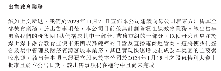 据了解,东方甄选向母公司新东方出售其全部教育业务已获批准。出售完成后,东方甄选将成为一家纯粹的自营及直播电商公司。
