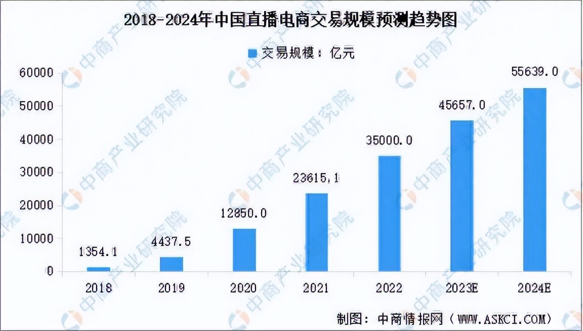 近几年,直播电商在增加就业、扩大内需、促进数字经济发展等方面发挥了积极作用,整个行业在加速增长,前景可观。据中商产业研究院分析师预测,2024年我国直播电商交易规模将达到55639亿元。