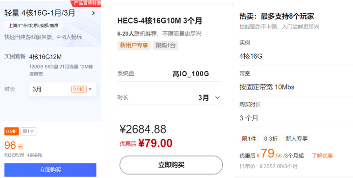 以4核16G 的服务器为例,腾讯云的套餐价格是96元/3个月,华为云的最低套餐为79元/3个月,阿里云的套餐价格此前为96元/3个月,目前已调整为79元/3个月。不过,腾讯云的带宽是12M,华为云和阿里云是10M,各家支持的玩家数量也有差异。