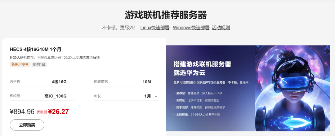 目前,点开华为云、腾讯云、阿里云的官网页面,游戏联机云服务器(幻兽帕鲁)都占据了特别醒目的位置,生怕玩家注意不到。