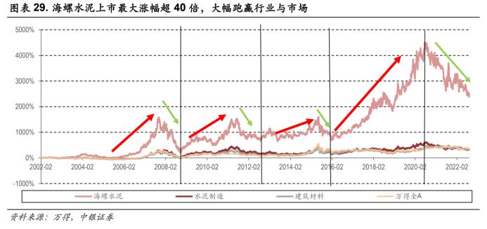 以海螺的是指表现来看,长周期内绝对是水泥制造行业的绝对优质标的,在上市后经理了三波半(目前是第四波下滑周期)行业周期,整体来看在2021年之前是一波完整的上行周期。