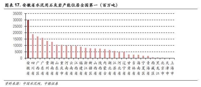 安徽拥有全国最丰富水泥用灰岩矿山储量及产能,远高于第二名四川,并且水泥产业是规模型企业,大规模产线的能效更高,电耗、煤耗更低,万吨级的熟料产线比千吨级的产线综合电耗低28%左右,水耗低18%左右。