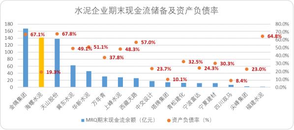 图:水泥企业 M RQ 期末现金流储备及负债率,来源: Choice金融客户端,锦缎整理