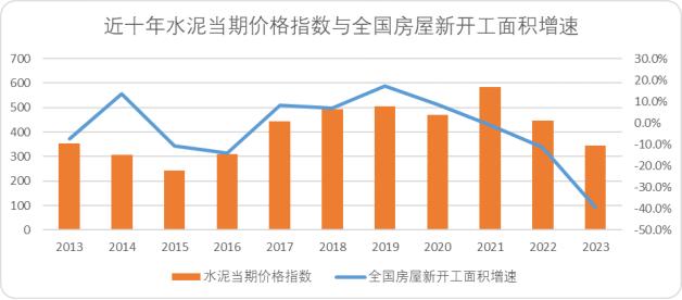 我们以几组数据对比来看,近十年水泥价格指数趋势与全国房屋新开工面积高度相关。在这一轮的波动周期中,2015-2019水泥指数随着地产新开工面积快速攀升,2019-2023又随着新开工面积陡降。