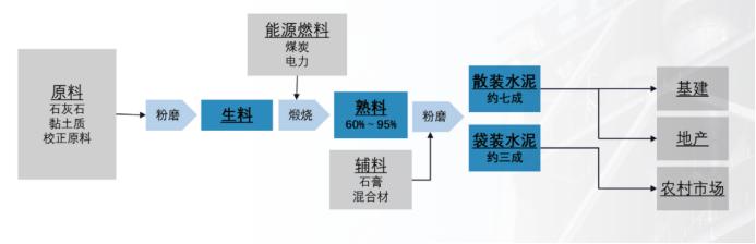 无论是何种制程工艺,均围绕着“两磨一烧”的主线逻辑:即粉末制成生料(将石灰质、粘土质和校正原料通过一定比例粉磨制成生料),煅烧熟料(将生料放入窑中煅烧,形成的以硅酸钙为主要成分的硅酸盐水泥熟料),再将熟料粉磨制成水泥(加入石膏和混合材料),如下图所示。