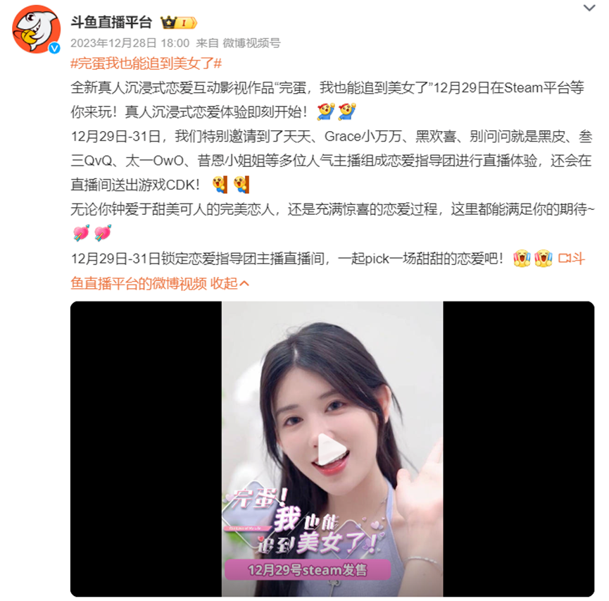 而《完蛋!我也能追到美女了》核心目的似乎也是如此。游戏的制作背景来自于斗鱼旗下的活动项目,参与的女演也是该平台女主播,在后续游戏上线后斗鱼直播官方微博配合游戏进行了一波营销,捧人上位意图明显。