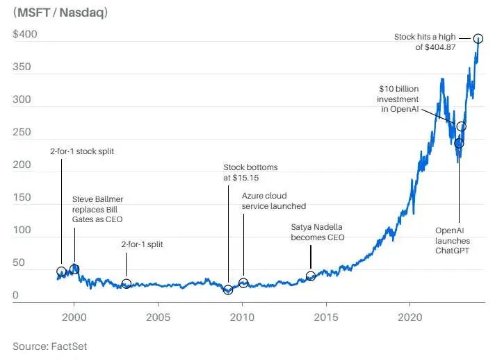 比尔·盖茨卸任首席执行官近25年后,在萨蒂亚·纳德拉的带领下,微软和微软股价达到了新的高度。