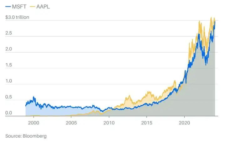 在和苹果的竞争中,云和人工智能的兴起让微软获得了优势。今年早些时候,微软取代苹果成为全球市值最高的公司。