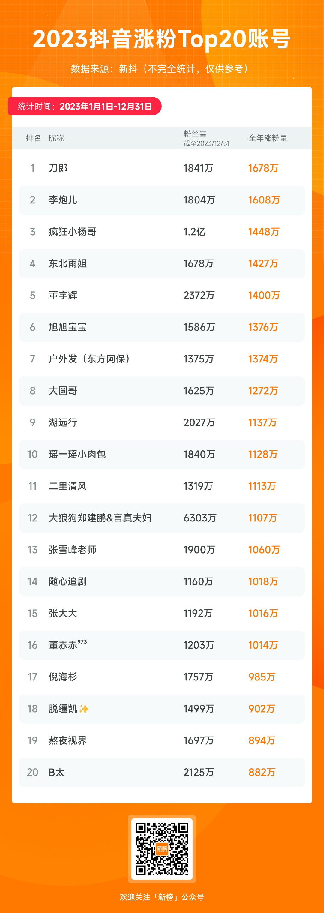 据新抖数据不完全统计,“刀郎”以全年涨粉1678万的成绩,成为2023年涨粉最多的达人。