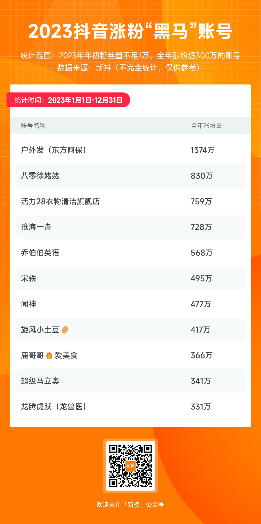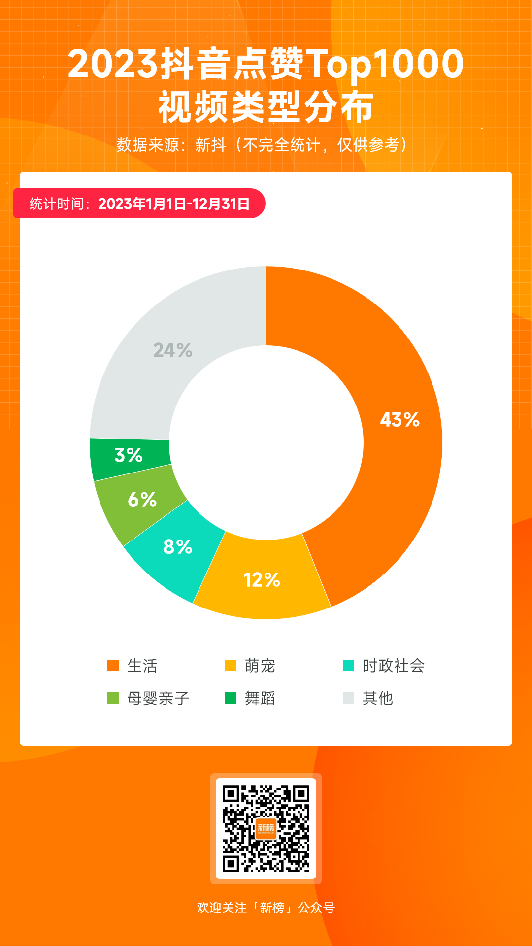 新榜编辑部通过新榜旗下抖音数据工具新抖数据,拉取了2023年1月1日至2023年12月31日期间的抖音数据,希望借此复盘抖音过去一年的变化,在迷雾中寻找未来一年的内容趋势。