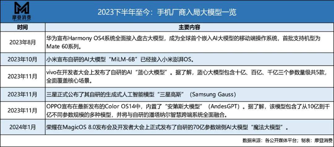 自2023年下半年以来,华为、小米、vivo、三星、OPPO、荣耀等诸多主流手机厂商争相竞逐火爆全球的AI大模型。