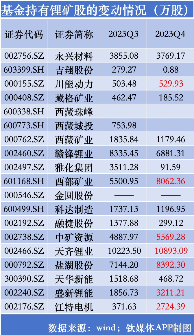 比如,2023Q4末,基金持有西部矿业(601168.SH)8062.36万股,在Q3末5500.95万股基础上增持了2561.41万股;去年末基金持有天齐锂业10893.09万股,在Q3末10223.50万股的基础上增持了669.59万股;去年末基金持有盛新锂能3211.21万股,在Q3末1856.73万股的基础上增持了1354.48万股。