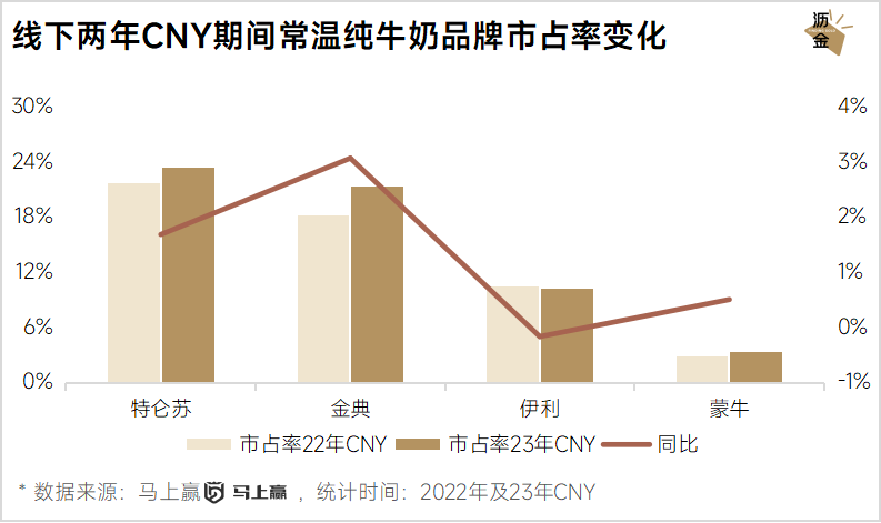 其中,特仑苏、金典分别是蒙牛、伊利的高端品牌,在CNY期间高端品牌的礼赠属性强,市占率大且增速快。