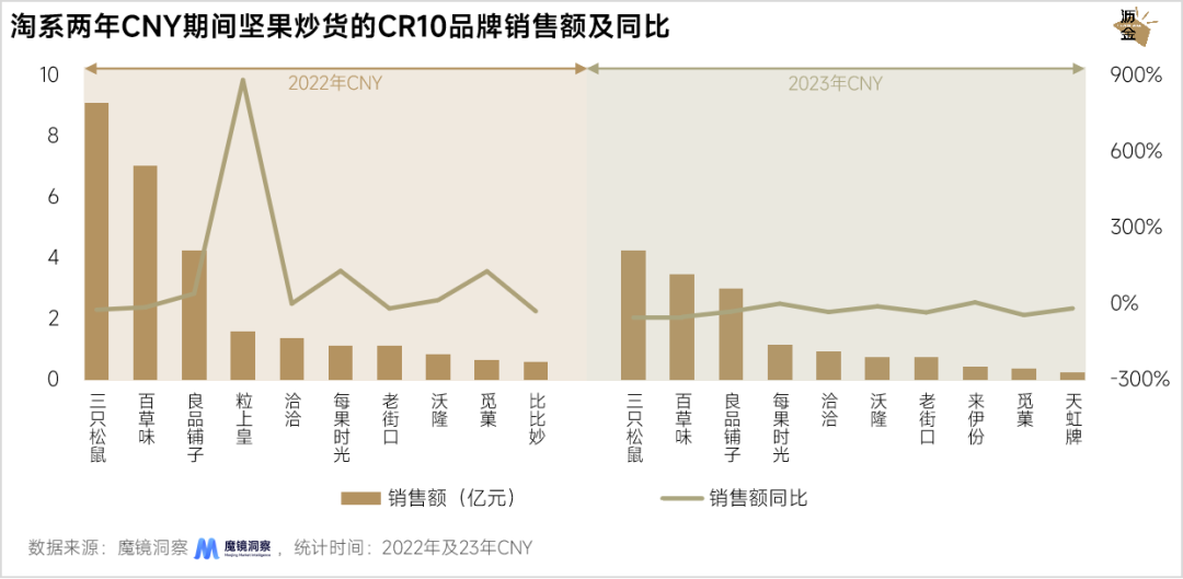 淘系两年CNY期间坚果炒货的CR10品牌销售额及同比