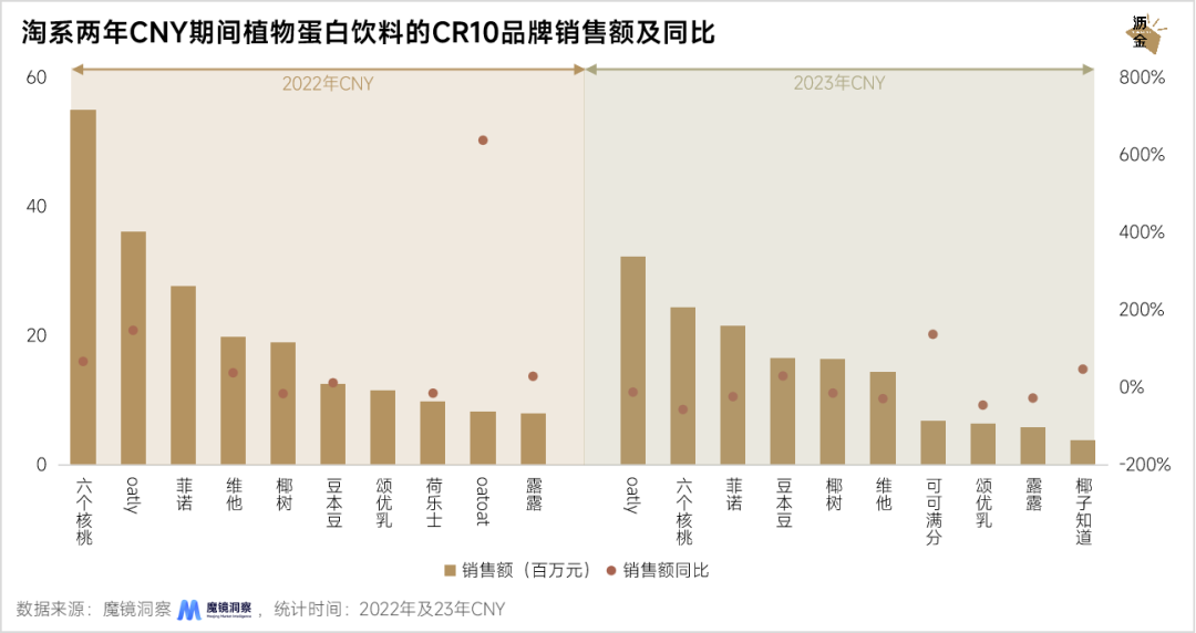 淘系两年CNY期间植物蛋白饮的CR10品牌销售额及同比