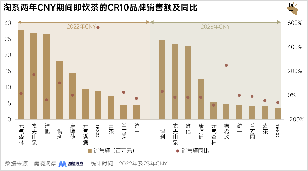 从淘系即饮茶CR10品牌连续两年的销售表现来看,农夫山泉、维他的连续两年CNY期间都卖了超20亿,销售额波动不大。