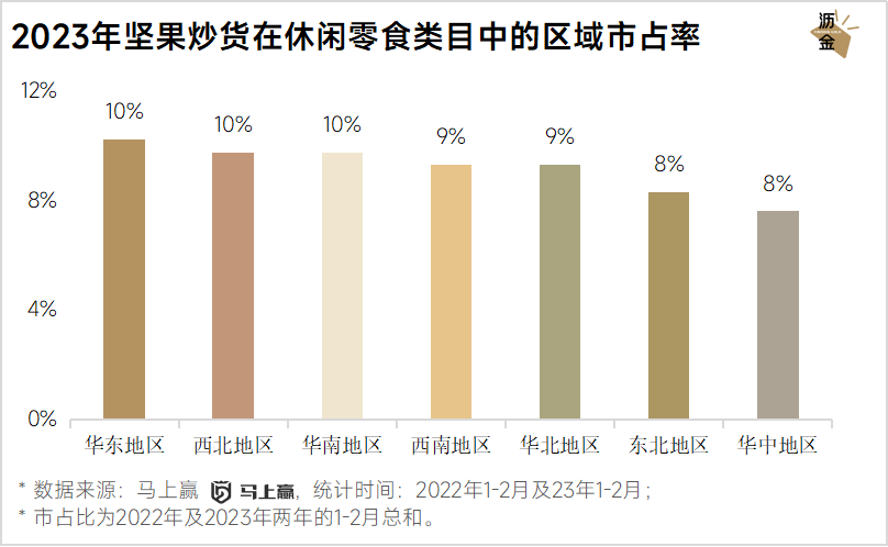 接下来,再聚焦休闲零食中销售表现最好的坚果炒货,看品牌格局及地区销售表现。