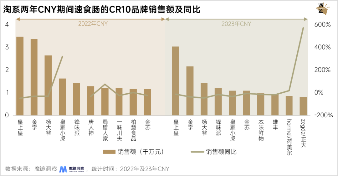 淘系两年CNY期间速食肠的CR10品牌销售额及同比