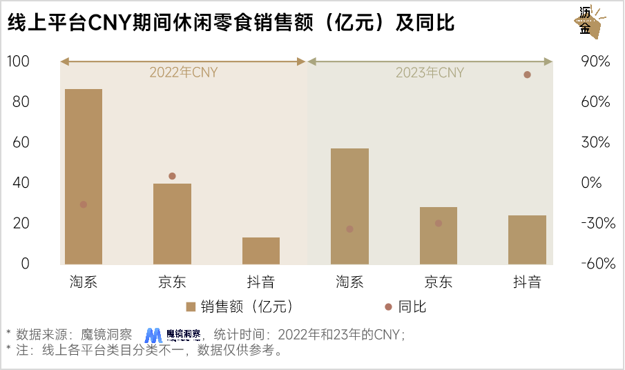其中,淘系是休闲零食的主战场,2023年CNY期间销售额超50亿元;抖音增速最快,销售额同比大涨80.6%。