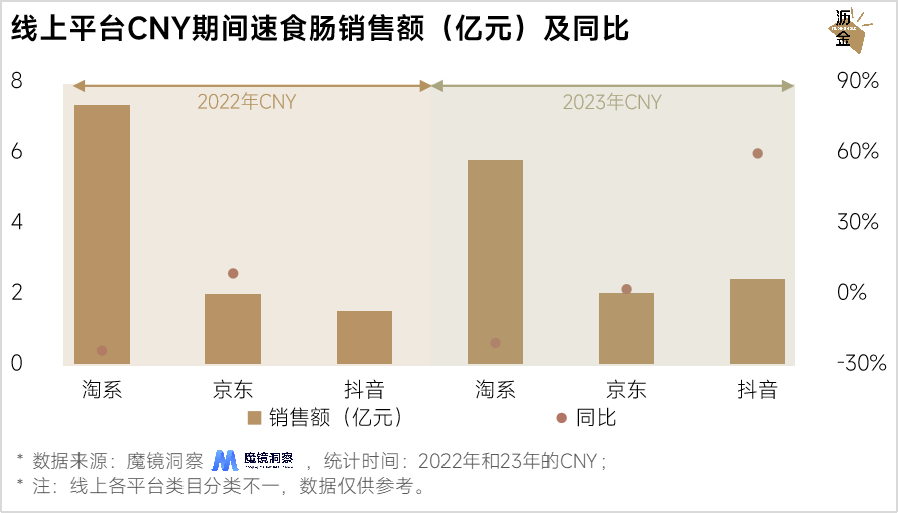 先看线上,CNY期间,速食肠连续两年在淘系、京东、抖音卖了10个亿,销售额同比在京东、抖音均有增长。