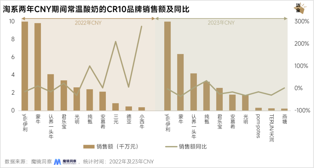 淘系两年CNY期间常温酸奶的CR10品牌销售额及同比