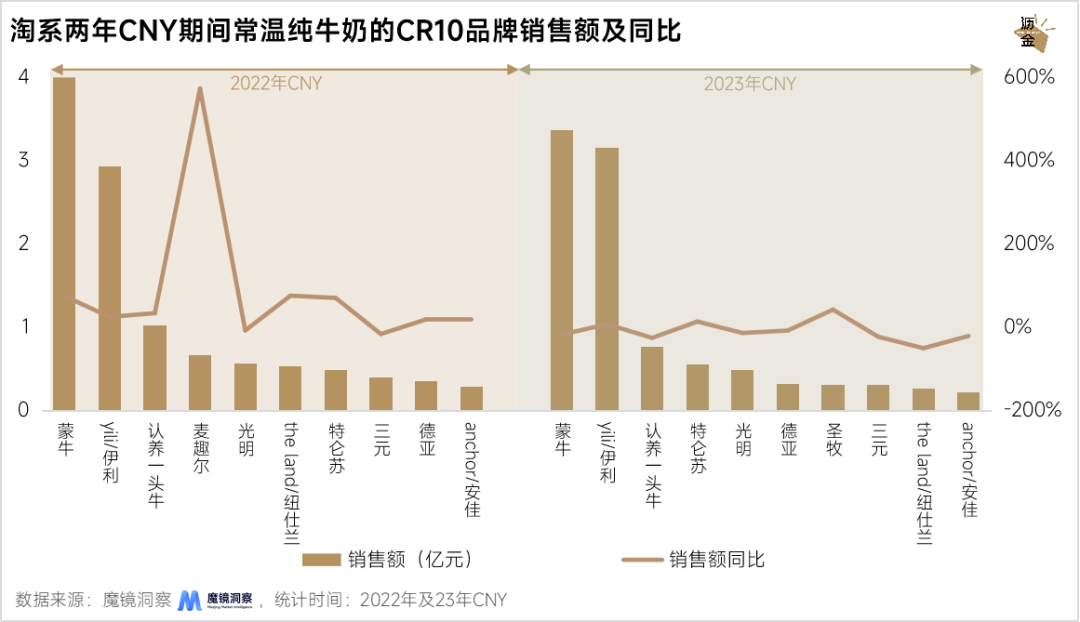 淘系两年CNY期间常温纯牛奶的CR10品牌销售额及同比