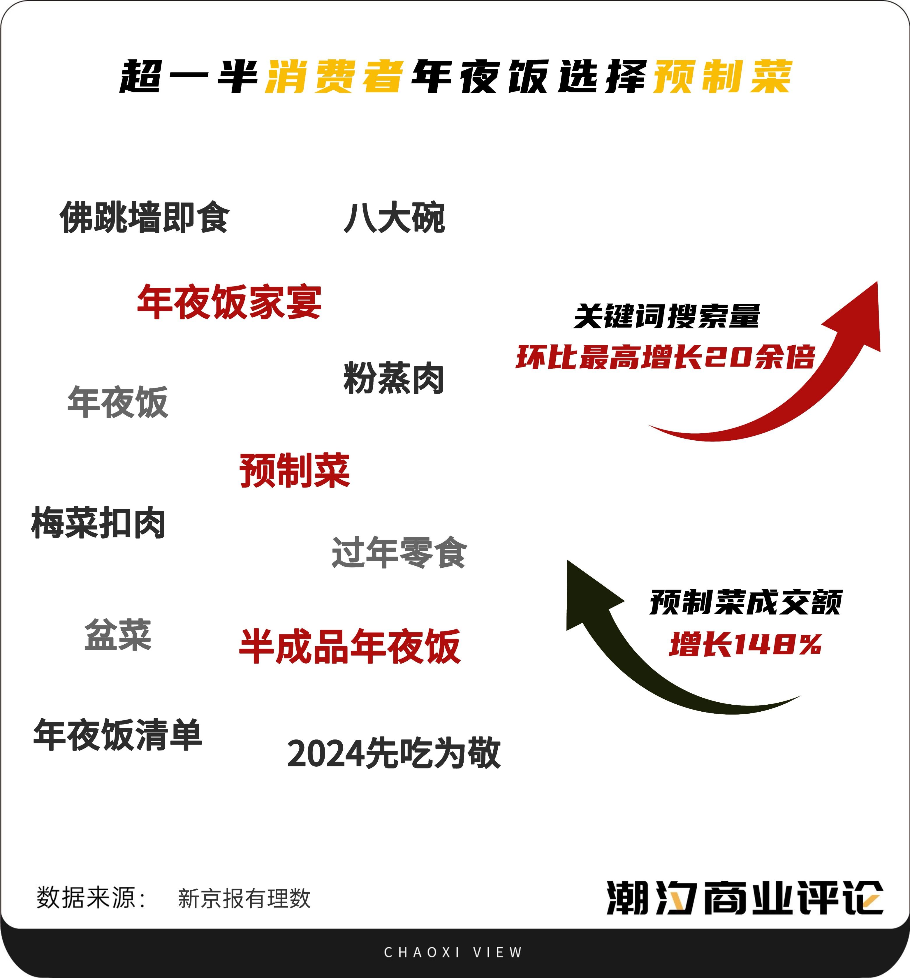 但,这并不能难倒这届年轻人。淘宝公开的数据显示,2024年年货节期间,淘宝APP上“年夜饭家宴”“预制菜”“半成品年夜饭”等关键词的搜索量环比最高增长20余倍,在淘宝直播间,预制菜成交额则增长148%。