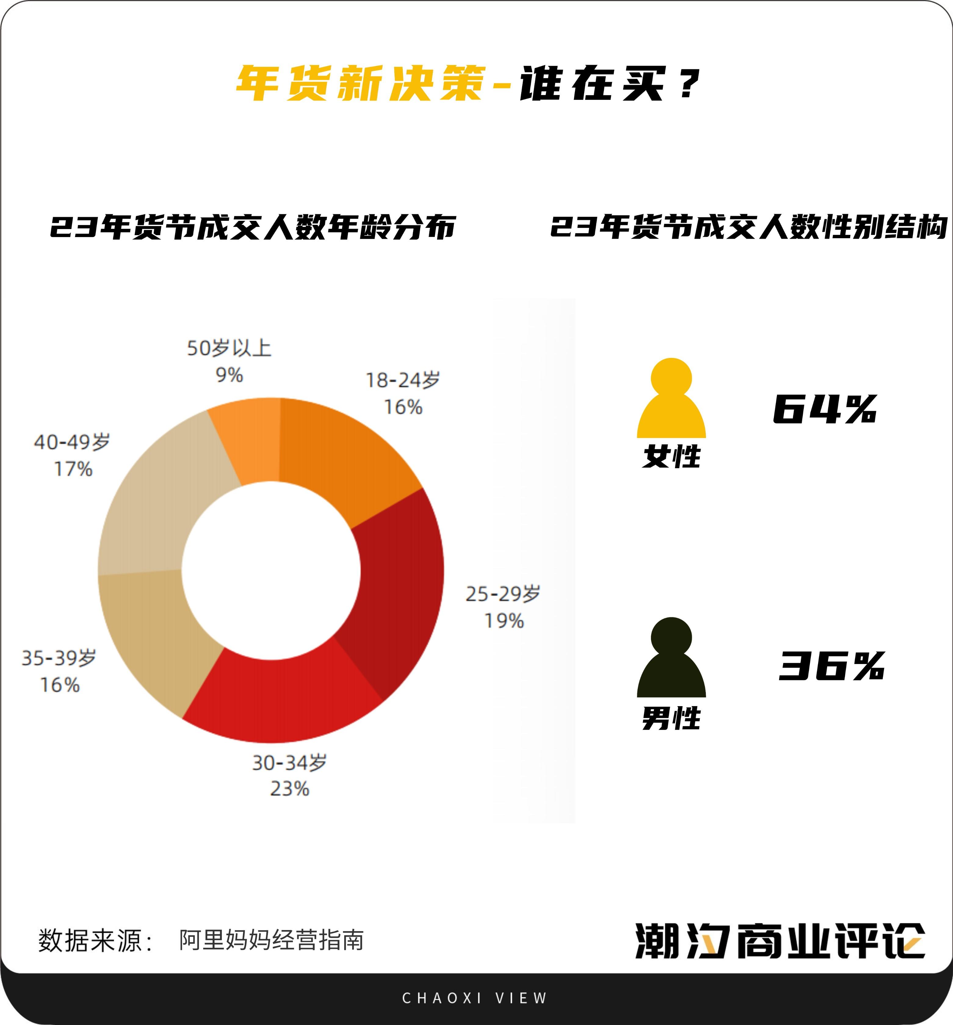 2024年的春节就是他们的“实战”要地,越来越多的年轻人正纷纷加入。有数据显示,18-34岁的年轻人已成为年货消费的主力人群。其中,25-34岁的90/95后是最核心的消费人群,18-24岁的00后则是最具潜力的消费群体。据最近公布的《天猫年货节2024年味新趋势》显示,目前在平台购买年货的下单用户中,95后占比已超过一半。显然,这届年轻人已成为家庭年货置办的主力军。