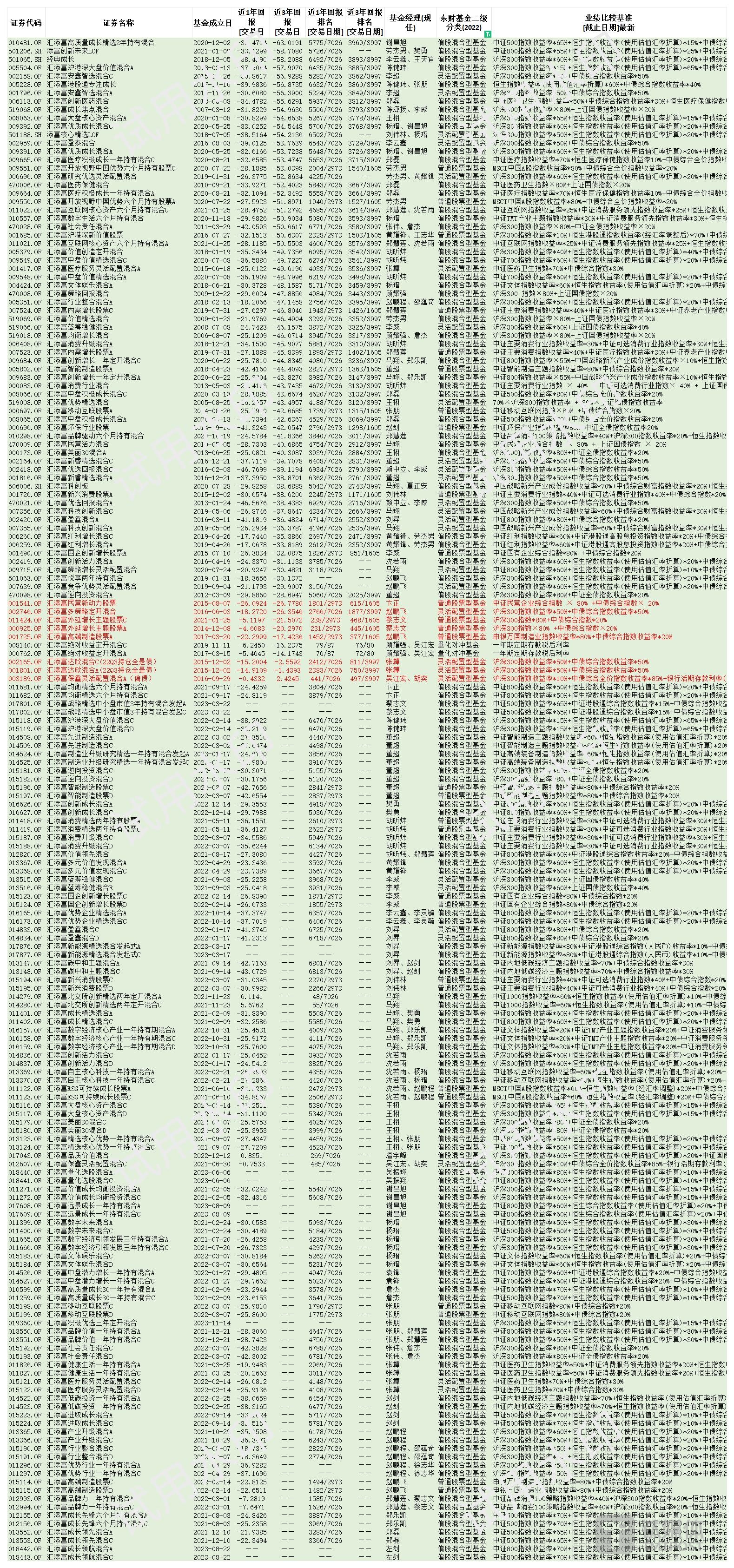 其次,从绝对收益角度也能看出境况之惨烈。上述77支成立时间超过3年的基金中,只有排名最好的汇添富保鑫灵活配置混合A录得正回报,近3年回报为2.42%。位于尾部的汇添富高质量成长精选2年持有混合(010481)不仅录得-63.02%的最大亏损,且排名也是垫底的3969/3997。同时,这些基金近3年回报中位数为-44.41%(对应基金为汇添富智能制造股票A),分位排名为1363/1605;由此可见,汇添富基金旗下主动管理型权益基金超过一半以上的排名都在同类后20%。