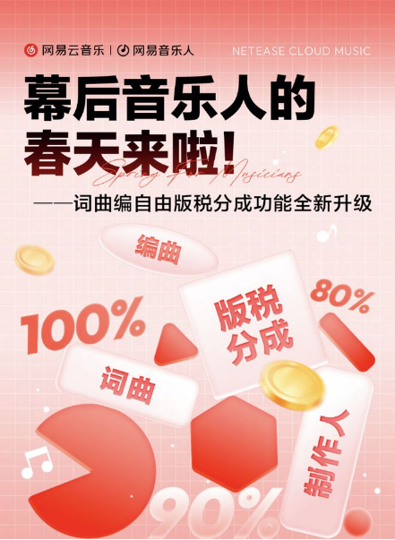 2024年1月30日,网易云音乐宣布面向音乐行业推出重磅升级举措,针对幕后音乐人群体发布「编曲人自由版税」功能,将编曲人群体正式纳入歌曲发布后版税收益分成中,通过真金白银的收益增长,让每一份创作都能收获应有的回报。