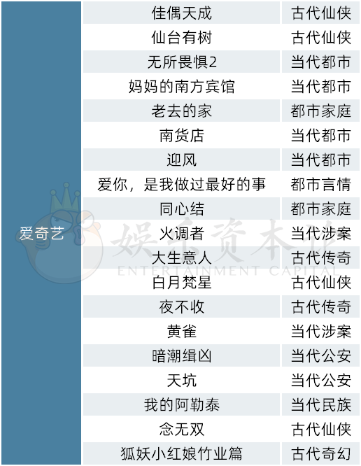从年代和题材来看,爱奇艺在剧集备案项目中呈现出重当代、轻古代、重涉案、轻玄幻的内容策略。爱奇艺始终在剧集领域处于领头羊地位,自2014年公开宣布开展“工作室”战略,爱奇艺已具备相当成熟的自制剧生产体系。