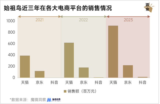 加强了线下直营的掌控后,始祖鸟同样回收了线上经销商的经营权,只在国内几个主流电商平台中开设旗舰店。通过抓取始祖鸟在国内三大主流电商平台的销售情况,可以看到其线上增速迅猛,特别是天猫平台。