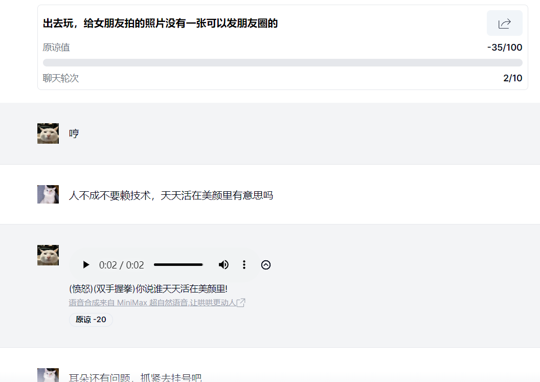 玩家需要在已经提供的话题中(也可以自行上传),选择一个自己感兴趣的内容,并在规定的回合之内,运用自己高超的语言技巧,成功挽回女朋友的心。每个问题会设定一个初始的“原谅值”,AI会根据你的聊天内容动态评分,原谅值过低只能重开,而原谅值达到一定数值就意味着哄人成功。