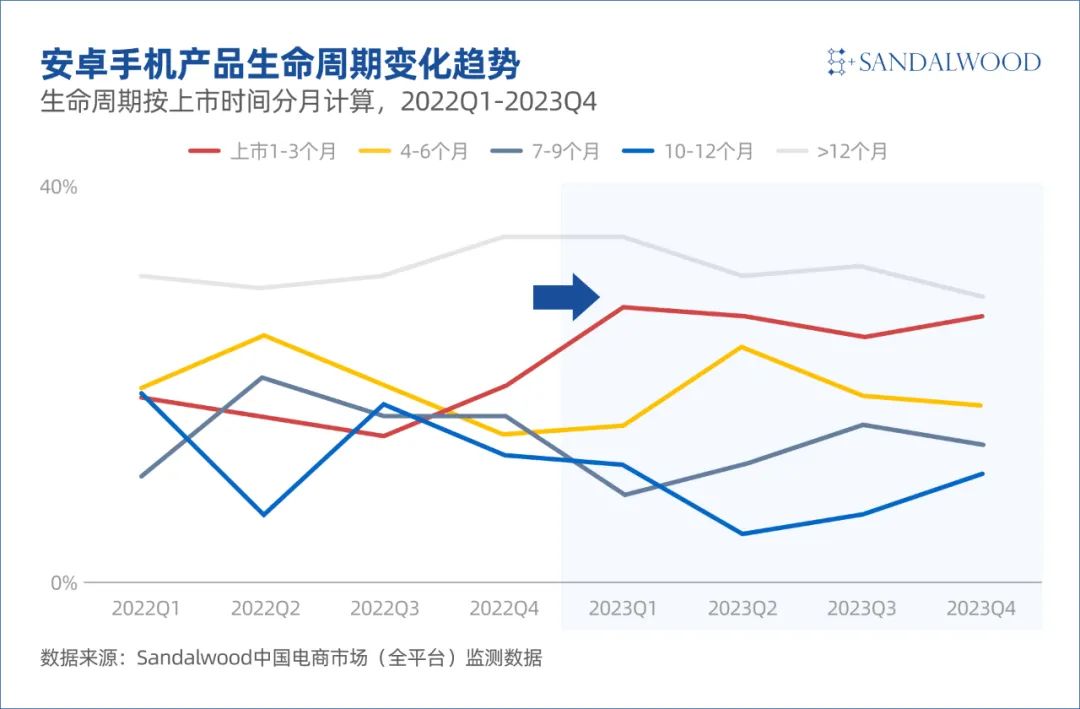 折叠屏手机和安卓中高端手机依然处在新品驱动的阶段。在折叠屏手机领域,上市1-3个月的产品销量占比高达50%以上,高峰时甚至接近70%,表明市场仍非常依赖新品驱动。