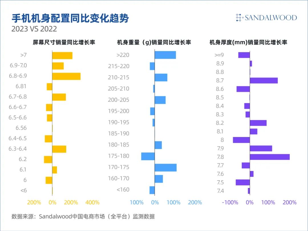 另一方面,有限配置下,均衡型产品配置也保持较高增速,从屏幕尺寸来看,6.3-6.4"屏幕尺寸,170g机身,7.8-7.9mm机身厚度也保持高速成长。这种均衡配置产品的快速增长,揭示了市场上存在一批更加重视便携性和舒适握感的消费者群体。