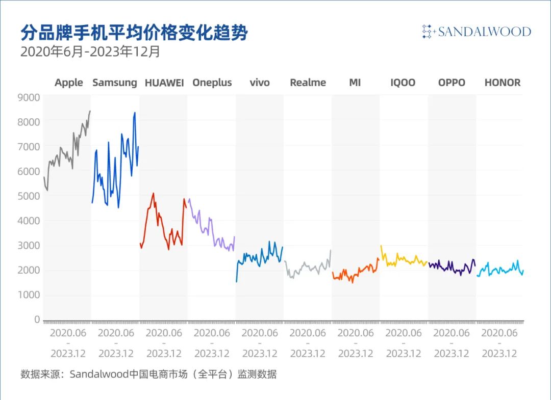 从最近的市场趋势来看,苹果、三星、华为等品牌的平均售价正在显著提升,显示出品牌在高端市场的强势地位。