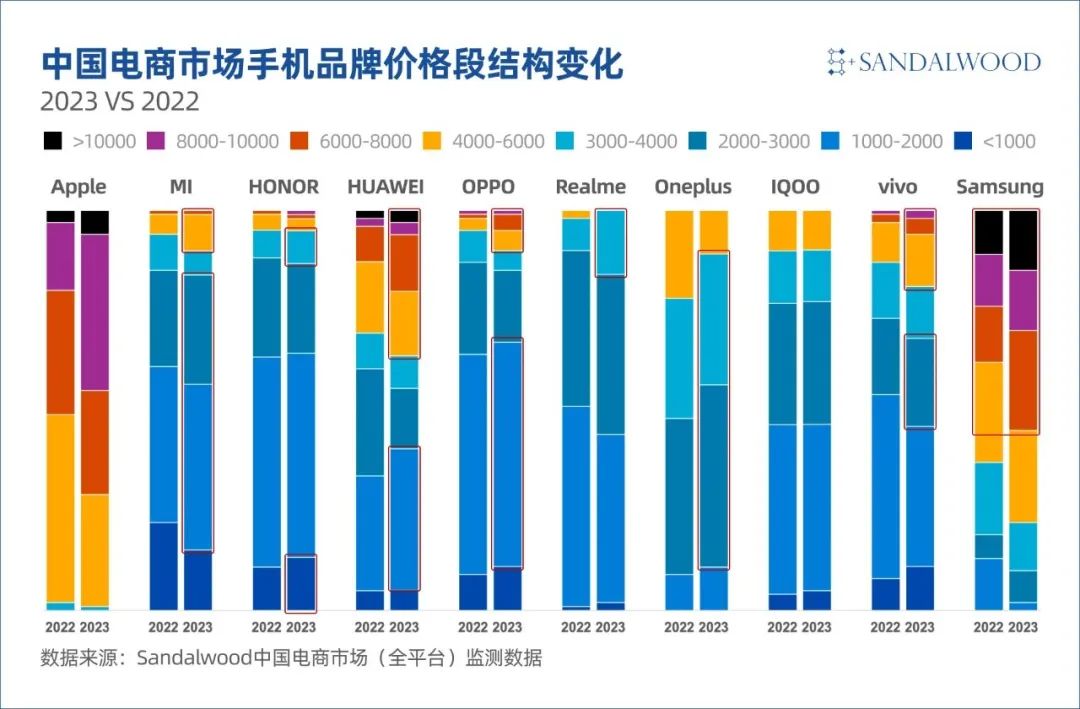 2023年小米的腰部力量、高端力量明显加强,苹果在超高端市场显著增长;荣耀在3000-4000元价位有所突破;华为在高低两端市场显著加强,中端市场待进一步突破;Realme在3000-4000元价位有所突破;一加在2000-4000元价位全面扩展;IQOO整体保持均衡;vivo、OPPO在4000元以上价位明显提升;三星在6000-8000元价位占比显著上升。