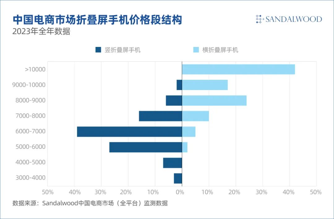在2023年,电商市场中直板手机销量同比增长1%,而折叠屏手机销量则增长了104%。其中,竖折产品同比增长115%,横折产品同比增长97%。