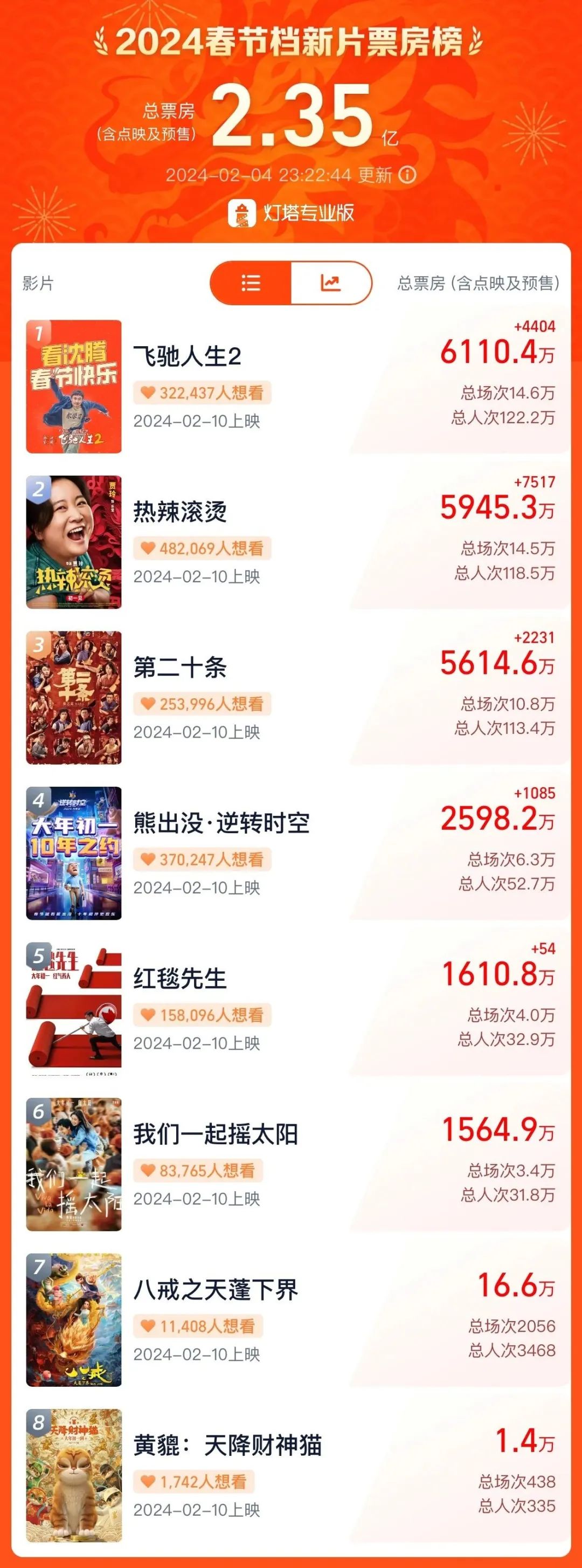 再来看预售数据,2月4日晚间,排在前三的是《飞驰人生2》《热辣滚烫》《第二十条》,三部影片的预售票房分别为6109万、5944万、5614万,几乎呈齐头并进之姿,“三巨头”格局初步显现。处在第二梯队的是《熊出没·逆转时空》《红毯先生》《我们一起摇太阳》,其中预售票房最高的是《熊出没·逆转时空》的2598万。