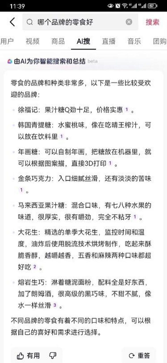 比如搜索“哪个品牌的零食好吃?”,AI会给出多个品牌的简介和特点讲解。从结果看,其搜素出来的内容应该是来自站内视频内容或第三方网站,实际效果一般。