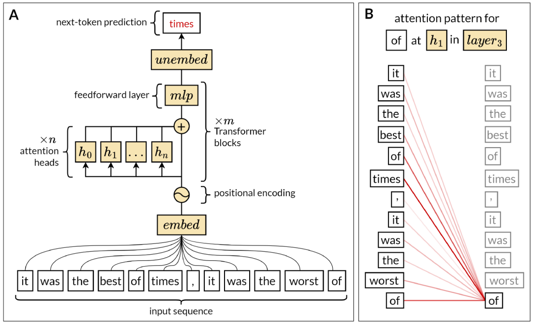 ▷图2. A. LLM的自回归模型变体的结构体系。来自输入序列的tokens首先被嵌入为向量,这涉及将每个token转换为一个高维空间,其中在语义上相似的token具有相应相似的向量。位置编码将关于每个tokens在输入序列中位置的信息添加到向量中。然后,这些丰富的向量通过连续的Transformer块进行处理。每个块包含多个attention heads,可以并行处理所有向量,以及一个全连接的前馈层,也称为多层感知机(multilayer perceptron, MLP)层。最后,在取消嵌入阶段,向量经历线性变换,将它们投影到一个与词汇大小相同的空间中,生成一组Logits。这些Logits表示词汇中每个潜在下一个token的未归一化分数。然后应用柔性最大值传输函数层,将这些逻辑转换为对词汇的概率分布,指示每个token成为序列中下一个token的相对可能性。在训练过程中,已知正确的下一个token并用于反向传播,而在推理过程中,模型在没有此信息的情况下预测下一个token。可以迭代地以自回归方式重复此过程,以生成多个token的预测。B. 自注意机制的可视化。每个attention head为序列中的每个标记??分配权重或注意力分数,该分数适用于包括??在内的序列中的每个标记?0−?。在这里,每条红线表示‘of’与输入序列中的每个其他标记之间的注意力分数,包括自身。在此示例中,注意力分数量化了每个标记相对于标记‘of’的相关性或重要性,较粗的线表示较高的分数。这个模式说明了注意力机制允许模型动态关注输入序列的不同部分,以得出每个标记的具有上下文细微差别的表征。每个attention head的注意力模式都不同,因为在训练过程中,每个头专门关注于选择性地关注标记之间的特定依赖关系。(图片引自[3])