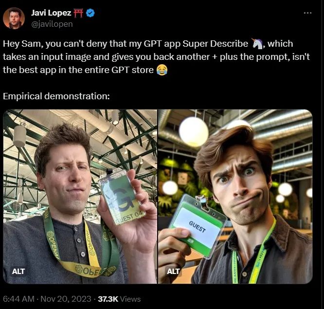 最近,他在OpenAI上线了一个GPT应用程序SuperDescribe做图生图,让用户使用DALL·E 3并附上详细的提示词获得图像。示例图配的是奥特曼的访客照,“嘿,山姆,你不能否认我的SuperDescribe是整个GPT store里最好的APP。”