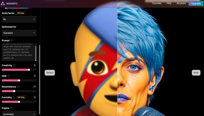 调整“HDR”滑块可以很大程度提高图像的高清效果。界面提示称,如果这一块的值调得过高,它会无限放大人物的皱纹,生出额外的眼袋细节、斑点等。也有“Resemblance”滑块可以控制生成图与原图的相似值,以控制AI过分增加的效果。