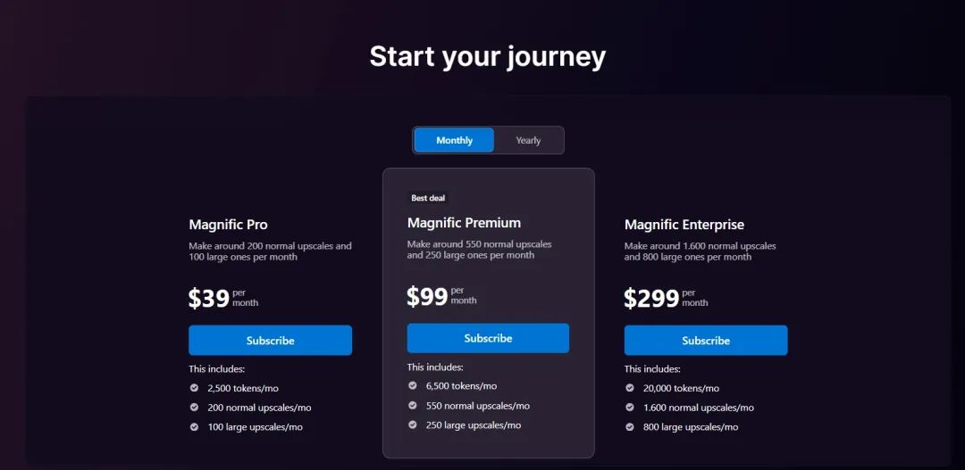 Magnific AI不是一个免费应用网站,用户注册后进入官网便会直面它的价目表,每月39美元至299美元不等,而且不能退款。