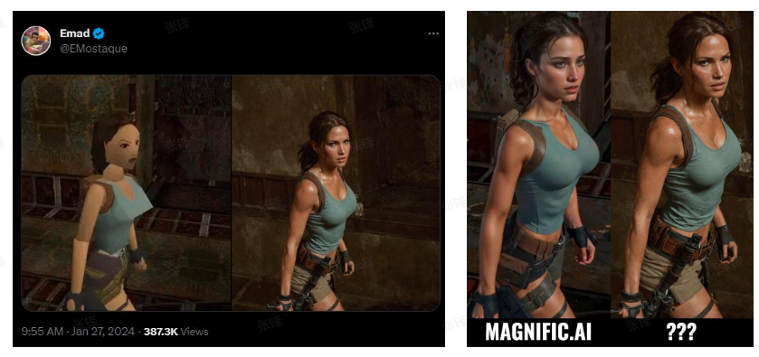2024年1月10日,Javi在推特上宣布Magnific AI能将任何图像放大并增强至10000*10000像素,将任何Midjourney图像放至8x。在示例中,他将《古墓丽影》的劳拉升级16x,用提示词让劳拉从像素块直接变成了3D形象。他补充:“我们图片太高清了,超过了推特能承载的4k。如果需要在推特上展示,我会提供截图功能。”