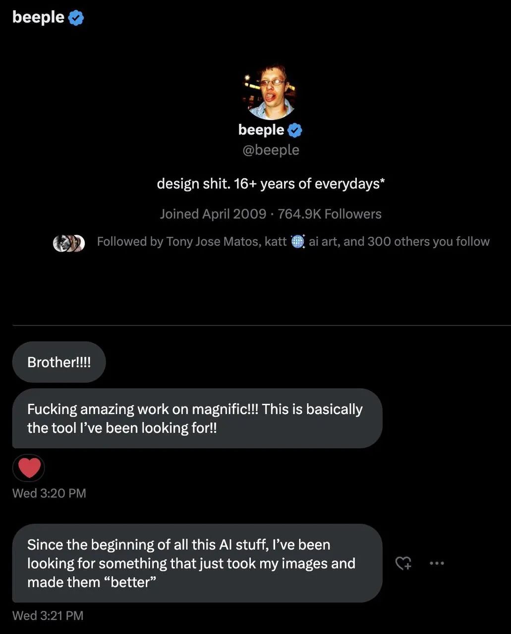 卖出史上最贵(6000万美元)数字绘画的艺术家 Beeple还私信Javi说自己每天都在使用Magnific AI。