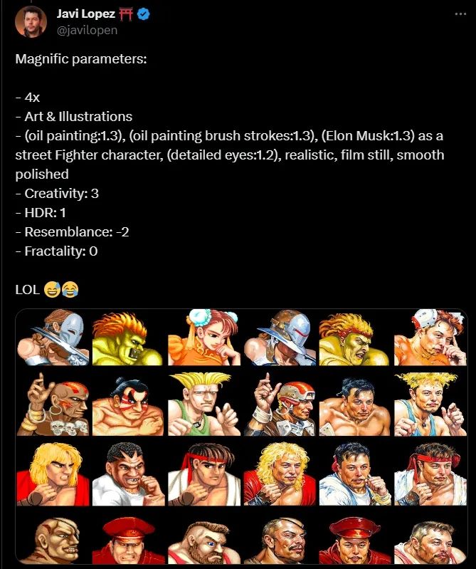 例如,他用提示词给马斯克、莱昂纳多、布拉德·皮特、汤姆克鲁斯换上《街头霸王》的风格。