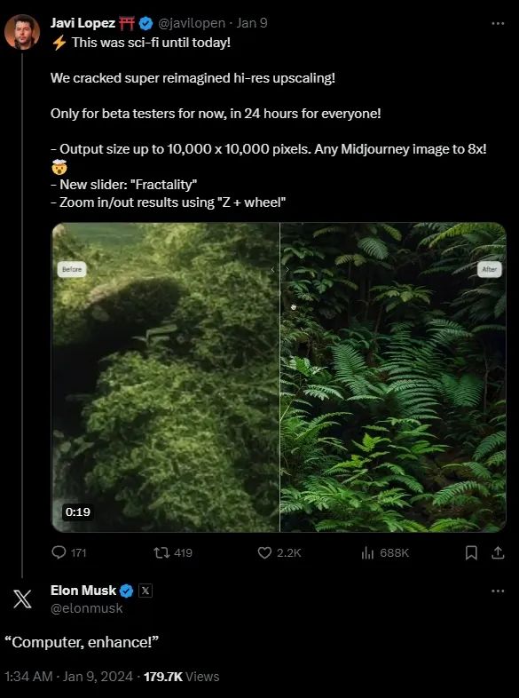 马斯克在他的推下留言:“计算机,增强!”Javi表示,他曾经多次联系马斯克,都没引起他的注意,这次马斯克的出现给了Magnific AI一个小小的推动力。
